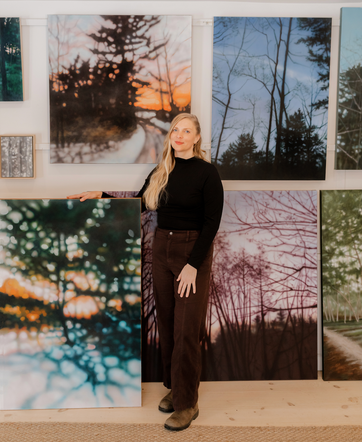 Emma is an abstract and impressionist painter located in Pepperell Mills, a beautifully renovated historic textile factory in Biddeford, Maine. She was inspired by her natural surroundings growing up among the dense pine forests, the sprawling fields, and the coastal towns in Southern Maine that seeped into her soul. She was lucky enough to find the space and opportunity to grow her art career while living on the East End of Long Island and now she is excited to be back living and creating in Maine surrounded by her family and the landscape that she loves.