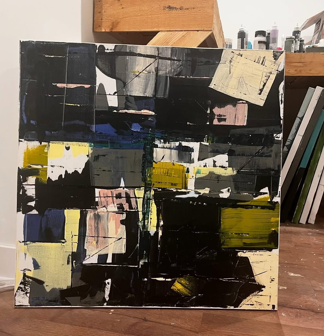 Each of my paintings begins with a layer of collage material fully covering the canvas, panel or page. The materials I use for this layer are typically vintage papers that were once used to educate, organize or keep records for the original owner (think: school workbooks, calendars, ledgers, etc.). I think often about how our everyday lives are built on a foundation of organized rules and expectations - on top of which the lovely chaos of real life sits. It makes sense to me to begin a piece with a nod to 'order', but this layer is typically completely covered by layers and layers of color and expressive marks. In the end you can only glimpse hints of that first layer, but it provides a steady base for me to play on top of.