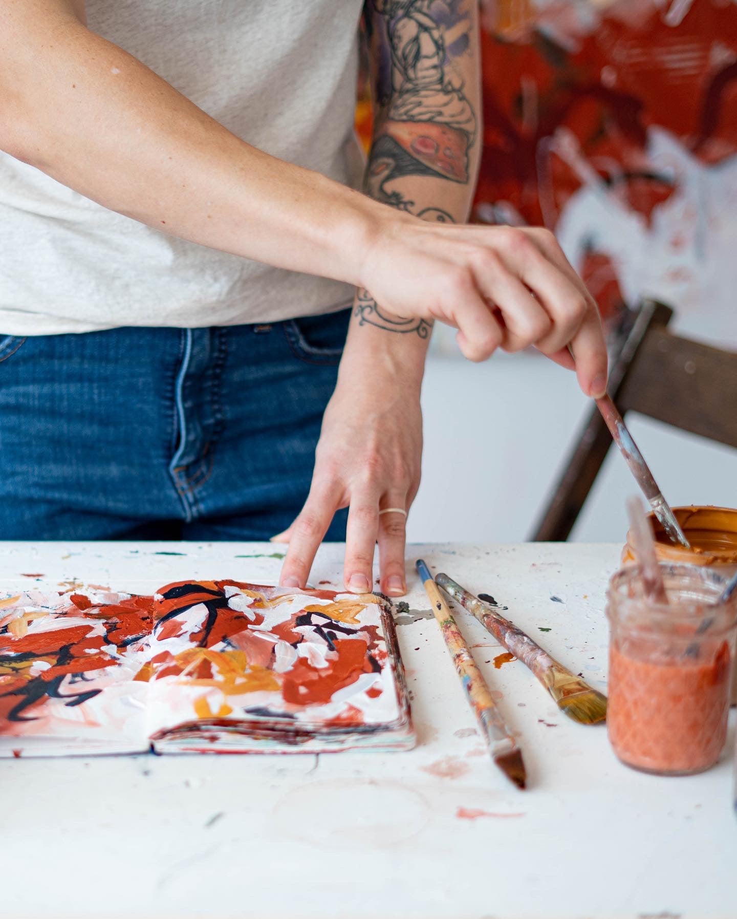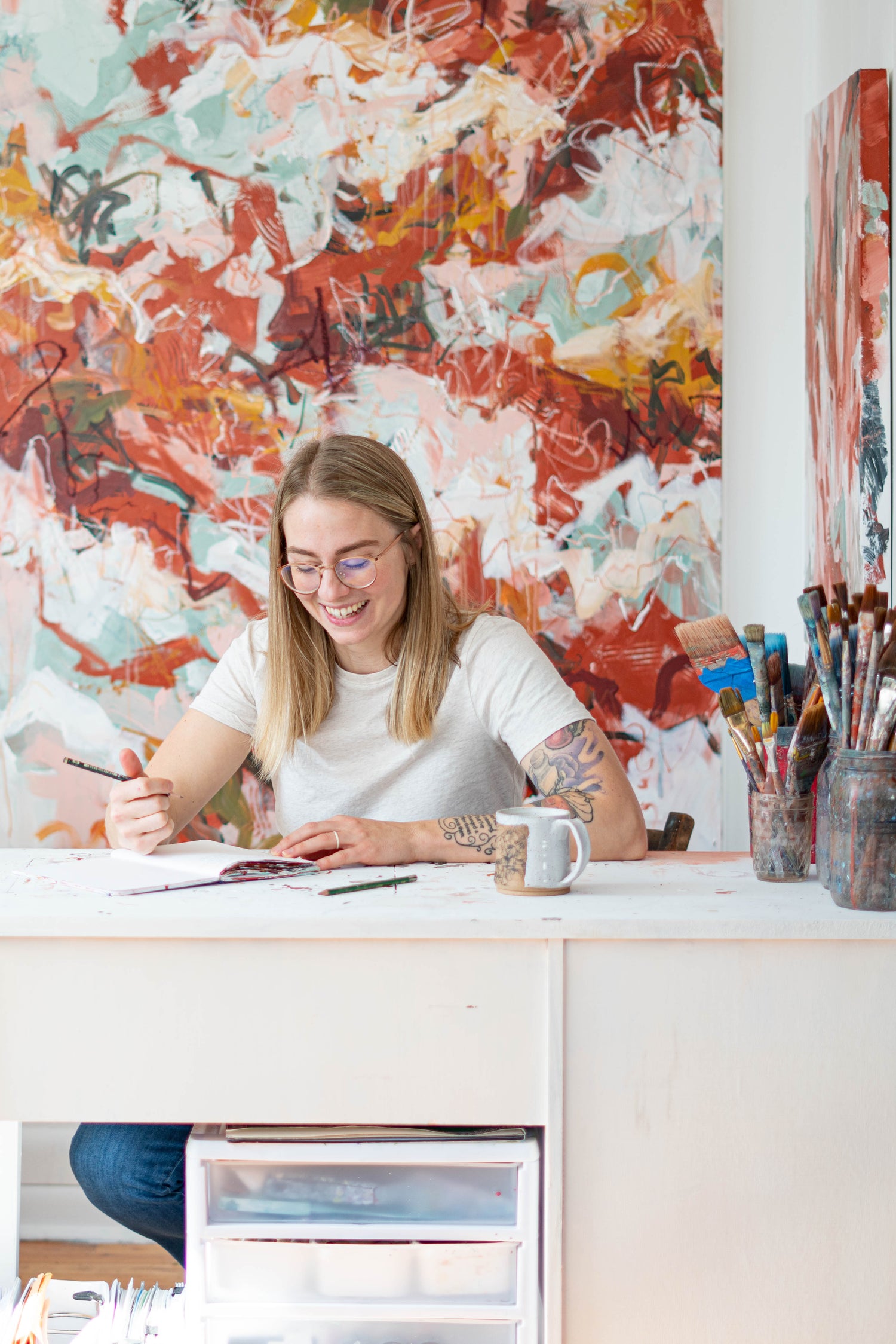 She creates large-scale, bold and feminine abstract paintings that tell the story of following the path of freedom, joy, expression, and play. Her works, often beginning with words, are regularly accompanied by brief essays, short stories, and poetry, giving insight into the influences behind her visual works.
