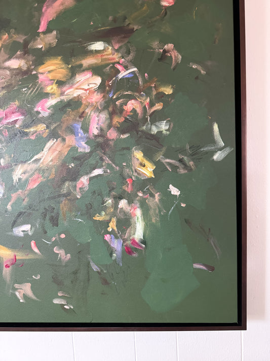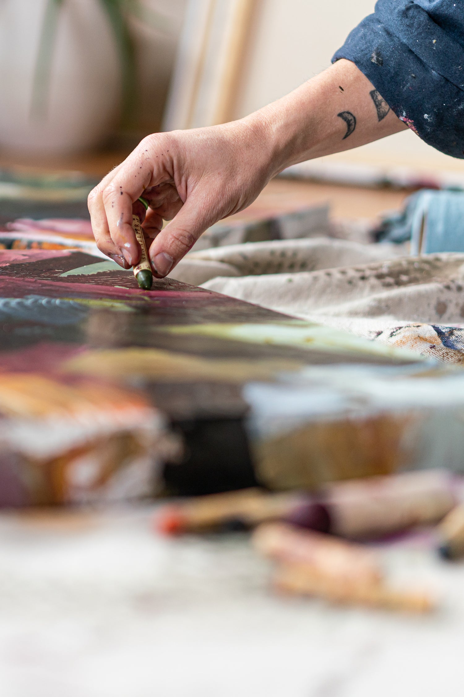 I primarily paint with my hands and use very few tools in my process. So much of my work is about the tactile experience and action of painting and I enjoy attacking the canvas with my hands.