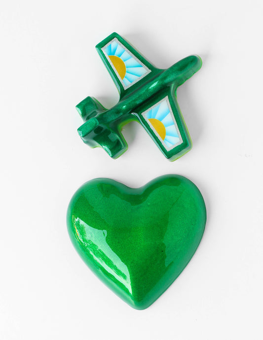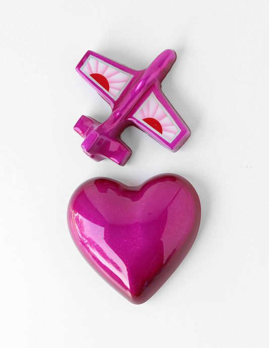 In this body of work I use a variety of automotive paints and finishes. All of the hearts and the plans are actually made with a transparent automotive pigment over a silver base color. These paints are called Kandy paint (the watercolor of automotive paint)