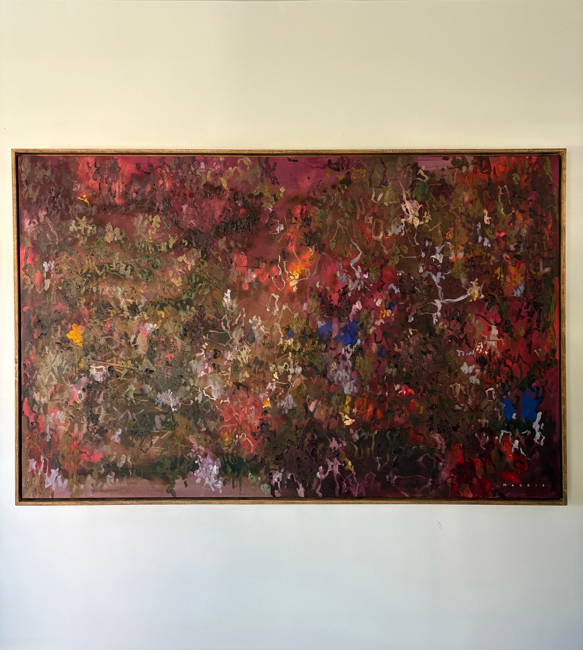 Acrylic, oil, chalk pastel, oil pastel, graphite and ink on unprimed canvas in a handmade pine floater frame
