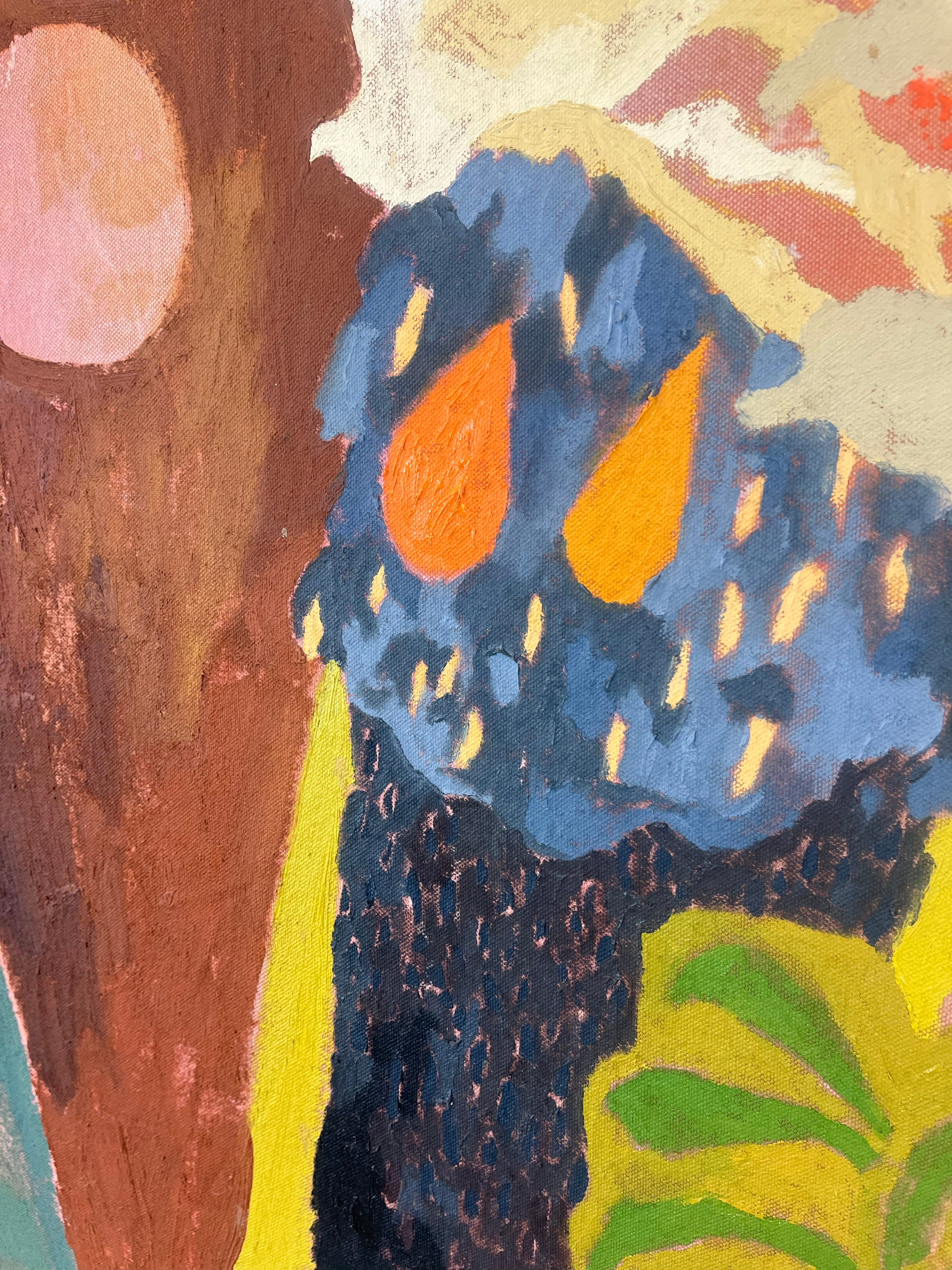 Her work reimagines common plants using whimsical colors and playful, painterly forms that speak to a communally-thriving vision of the future, beyond the shadow of the climate crisis, the two-headed snake of capitalism/colonialism, and anthropocentrism.