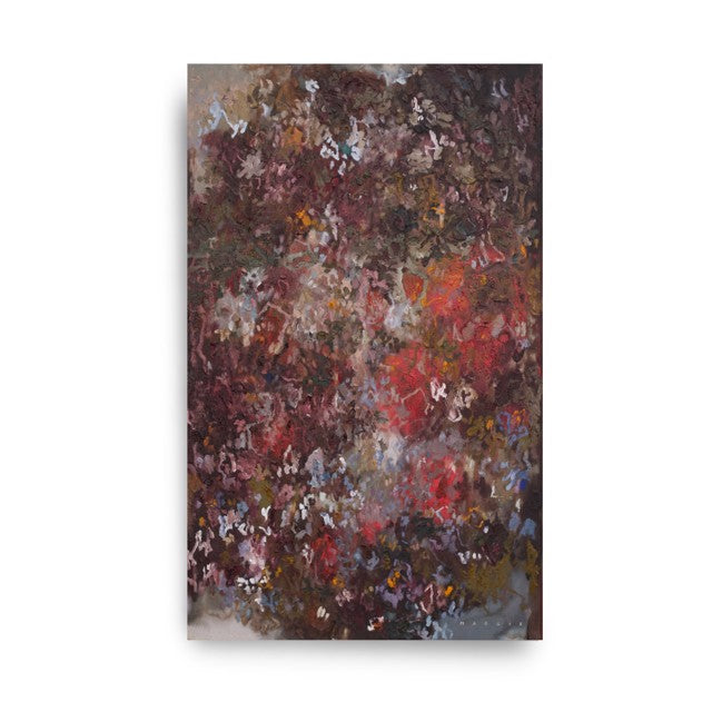 Acrylic, oil, chalk pastel, oil pastel, graphite and ink on unprimed canvas in a handmade pine floater frame