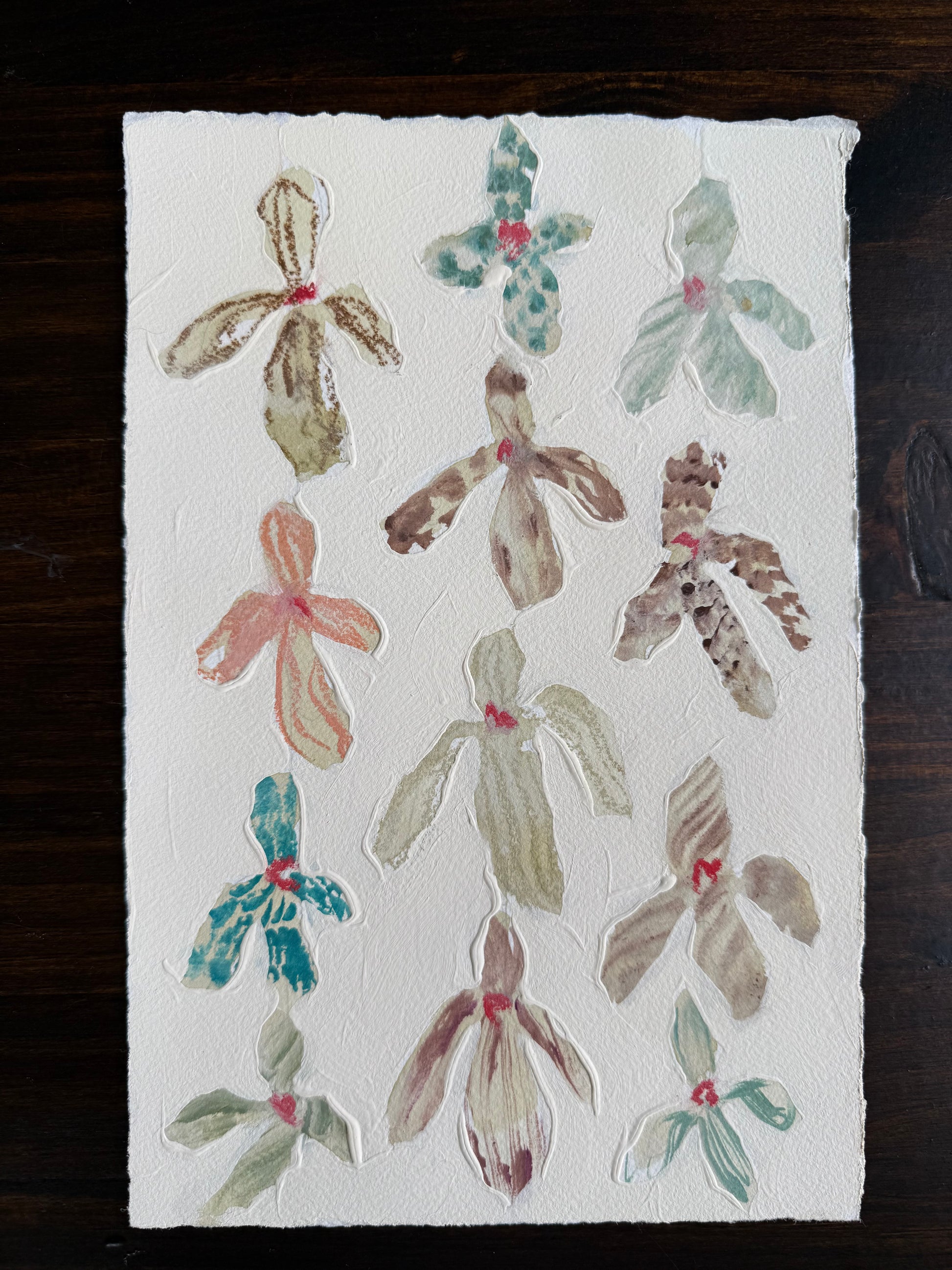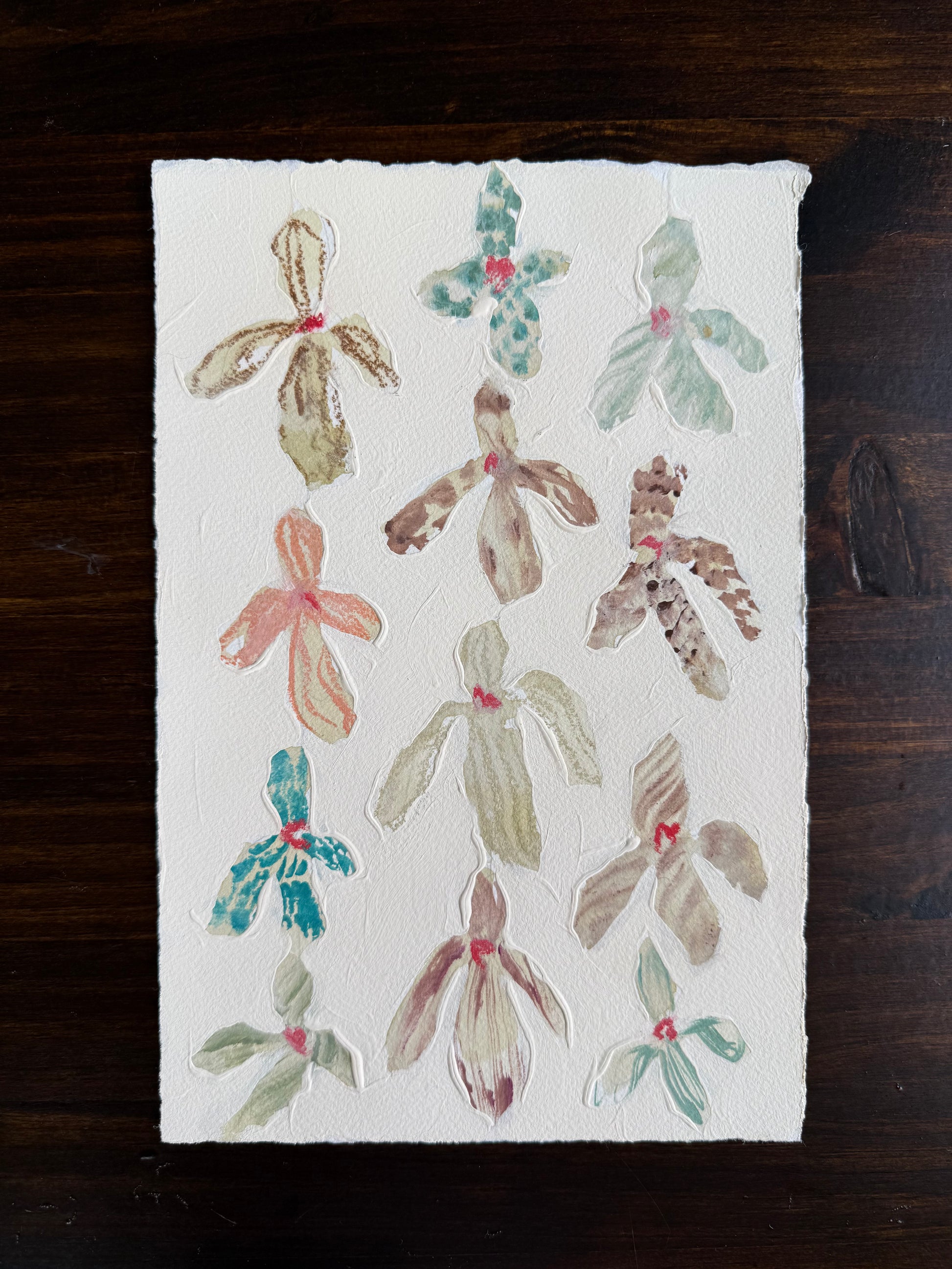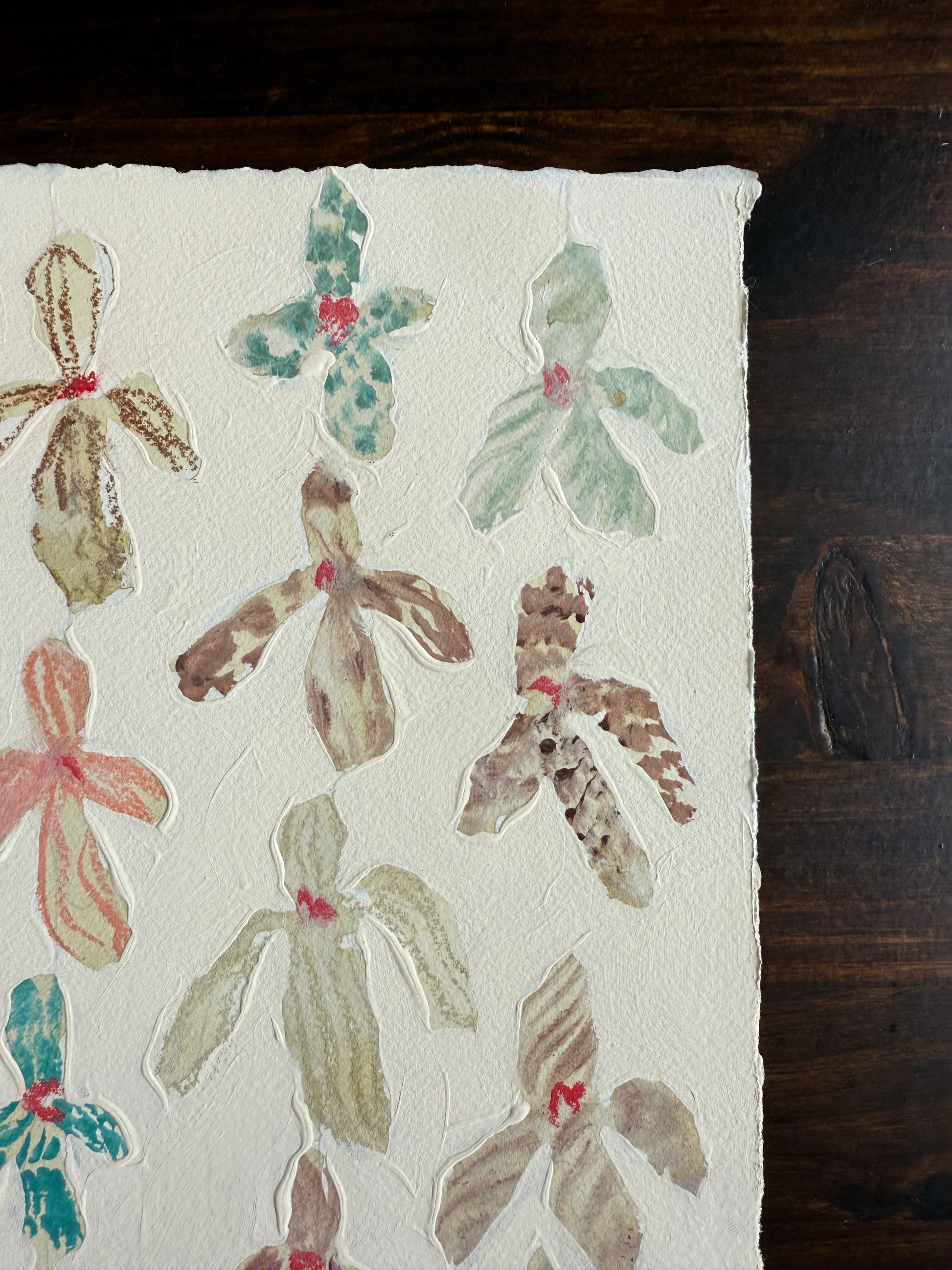 As her experience of time in motherhood shifts, so does the work. From more rigid grids of routine found in early motherhood to more fluid silhouettes of palmy irises as she returns to her own sort of pattern again. Marks become less sharp & quick. They start to draw out her own identity as time becomes hers again. With her background & formal training in drawing, Shelby uses mark making to emphasize that precise moment as if they are timestamps. Racing marks with time all while doing it with a nurturing quality of practice, her work expands on the essence of what time feels like in this very moment of motherhood.