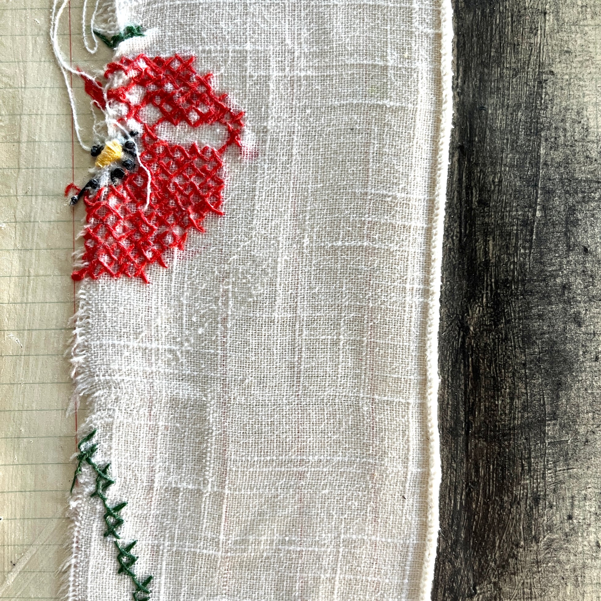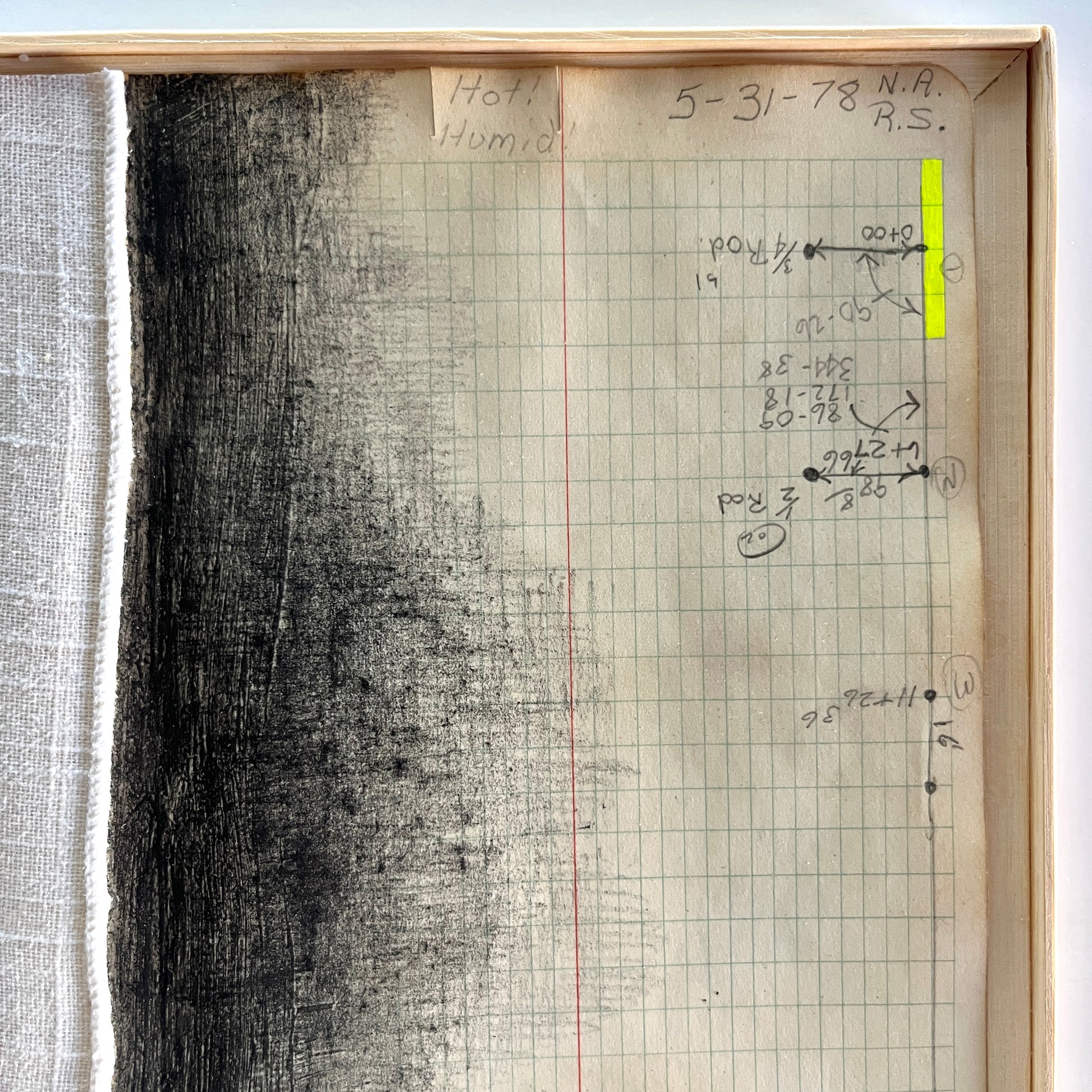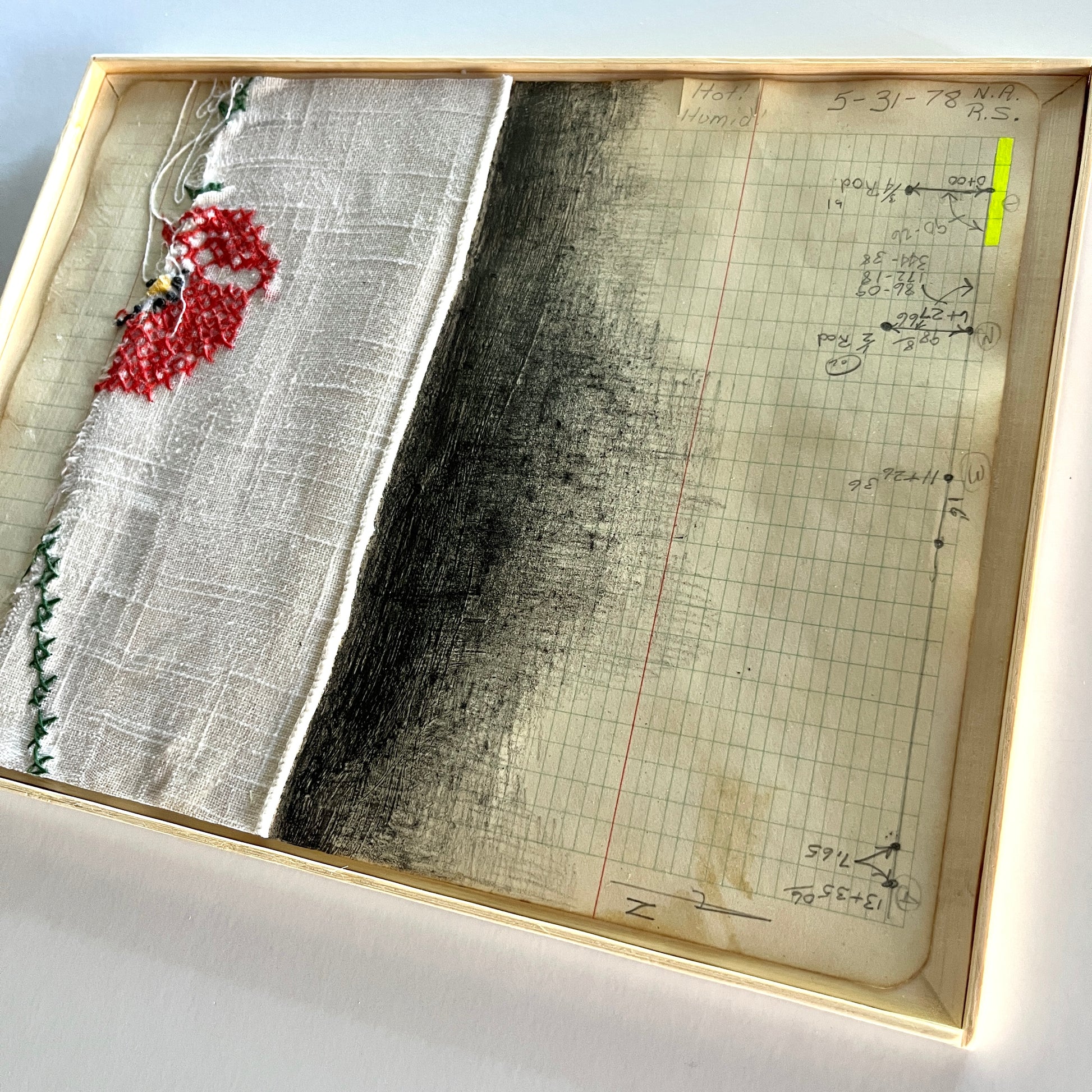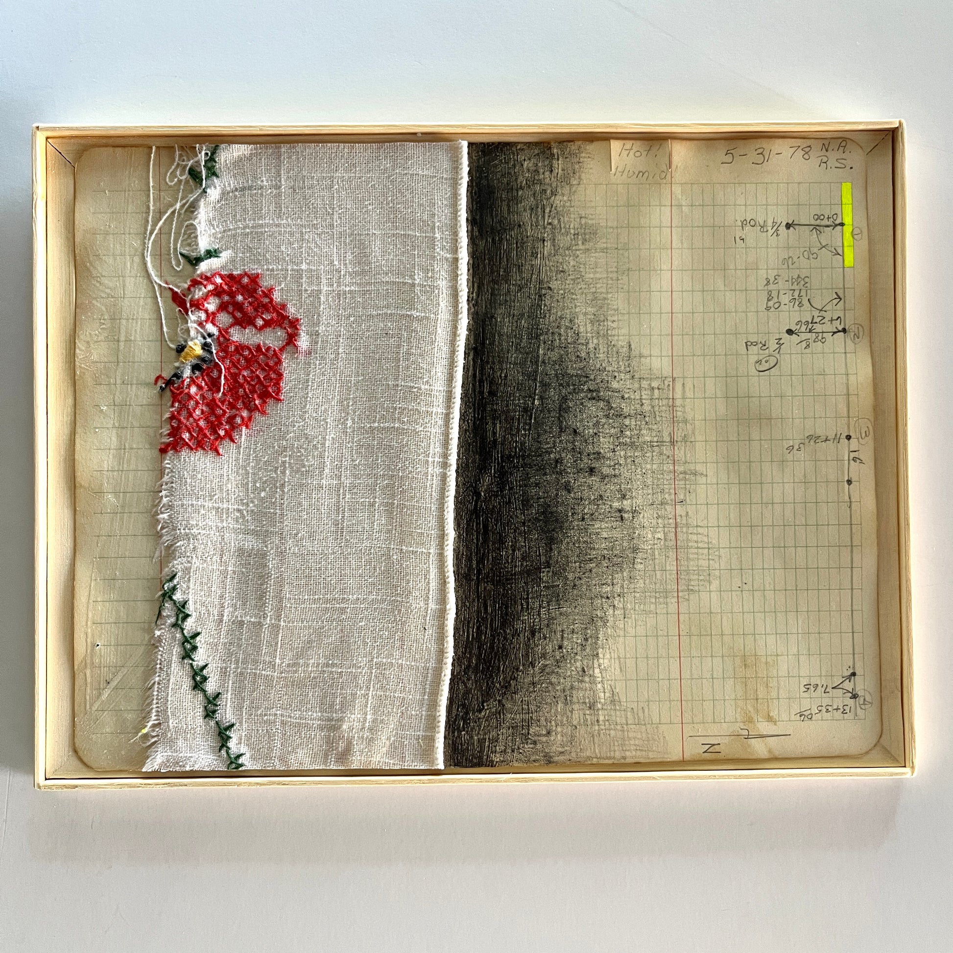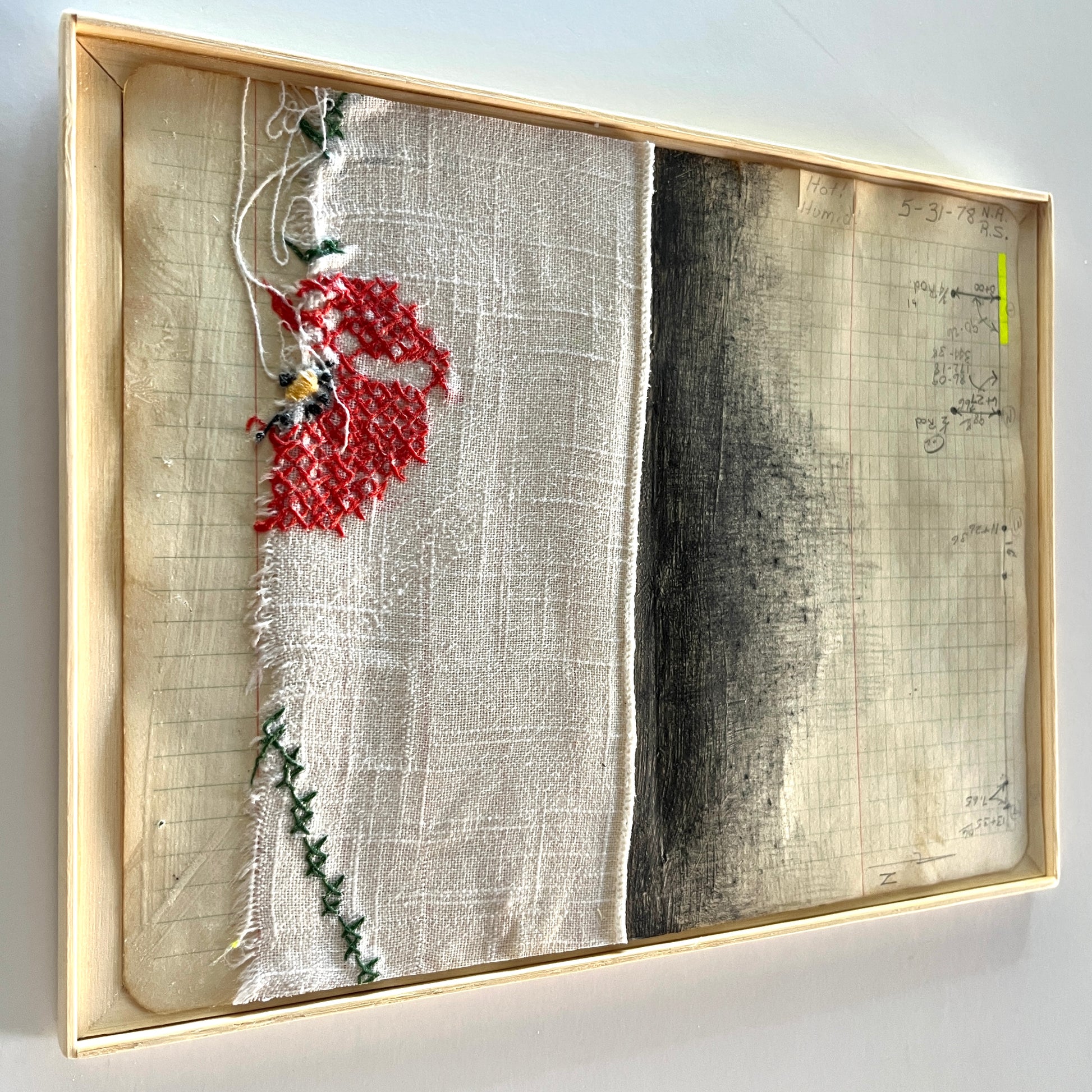 Ink and acrylic on vintage tablecloth and field book paper in wood and bamboo