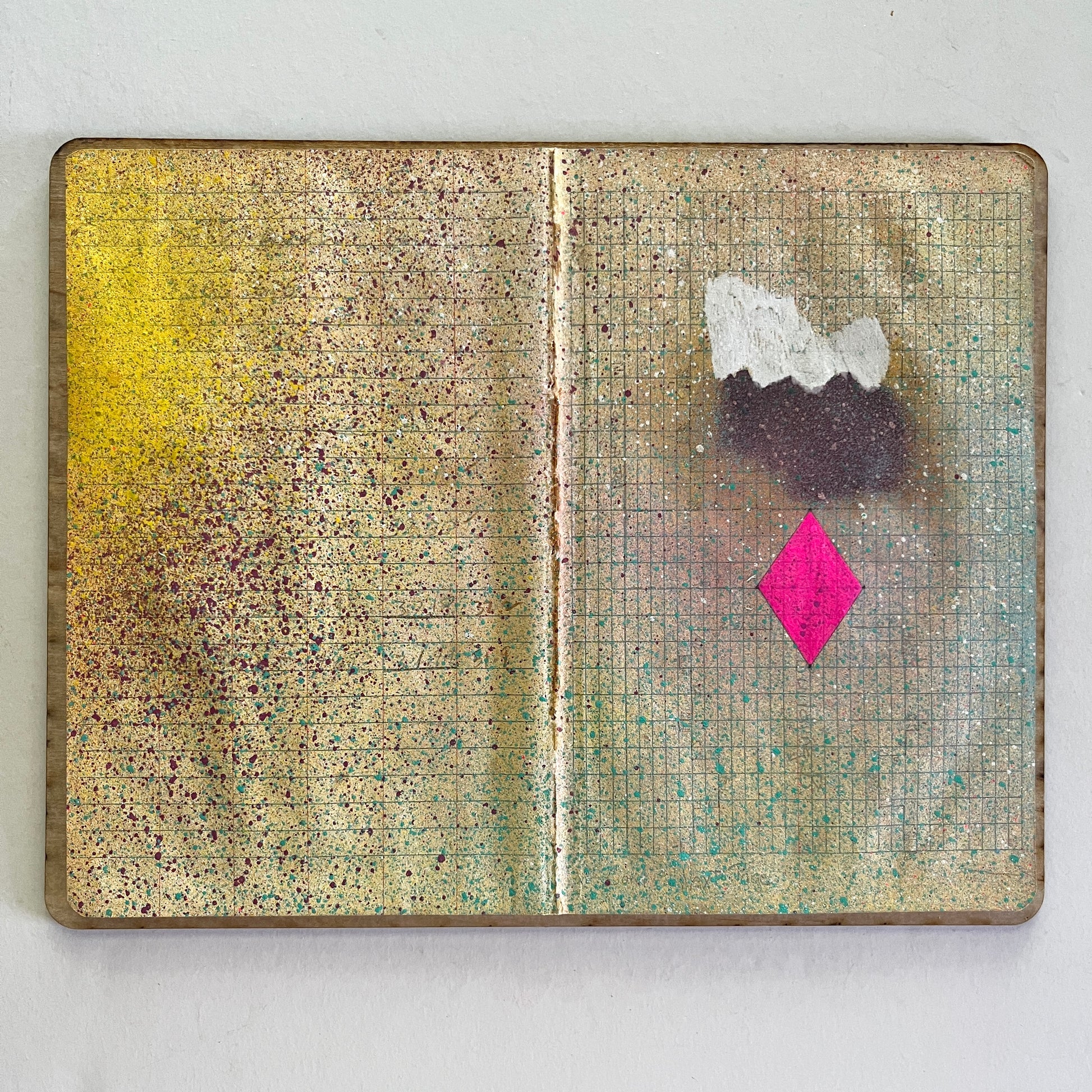 Ink and acrylic on used field book paper on wood panel