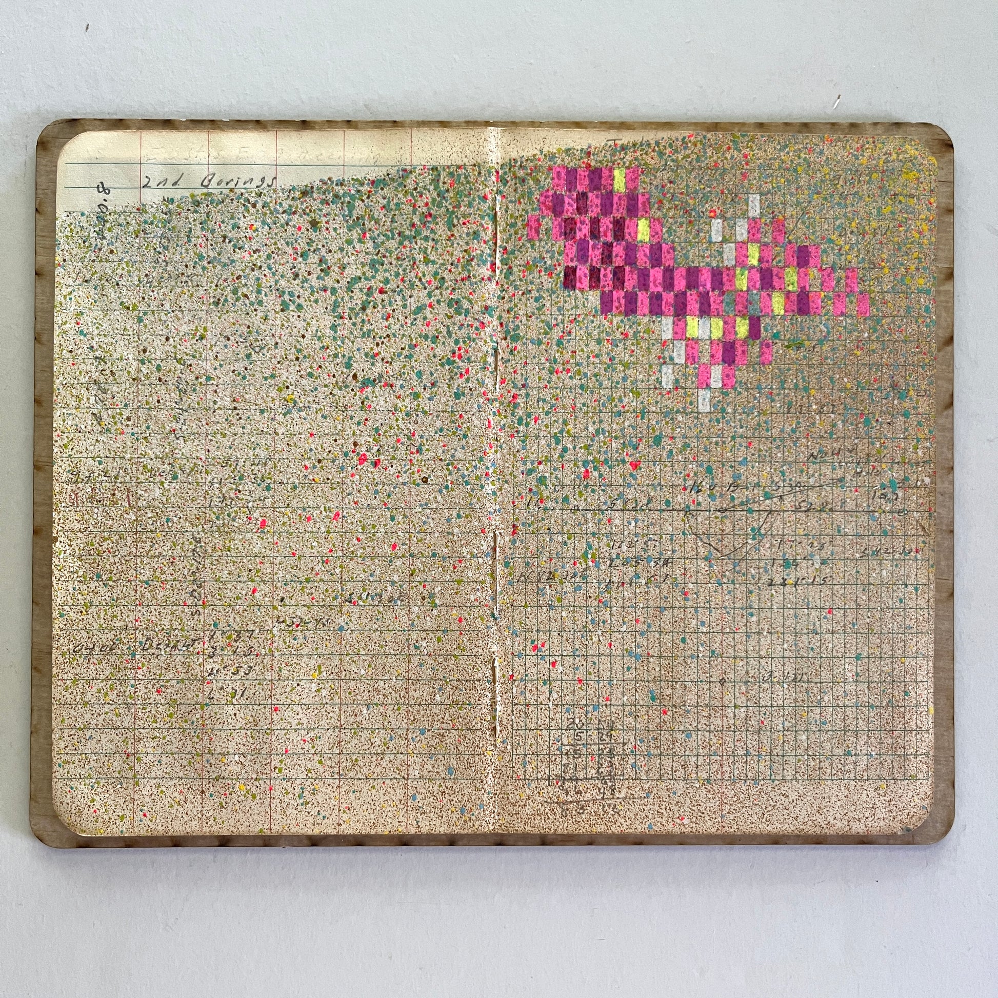 Ink and acrylic on used field book paper on wood panel