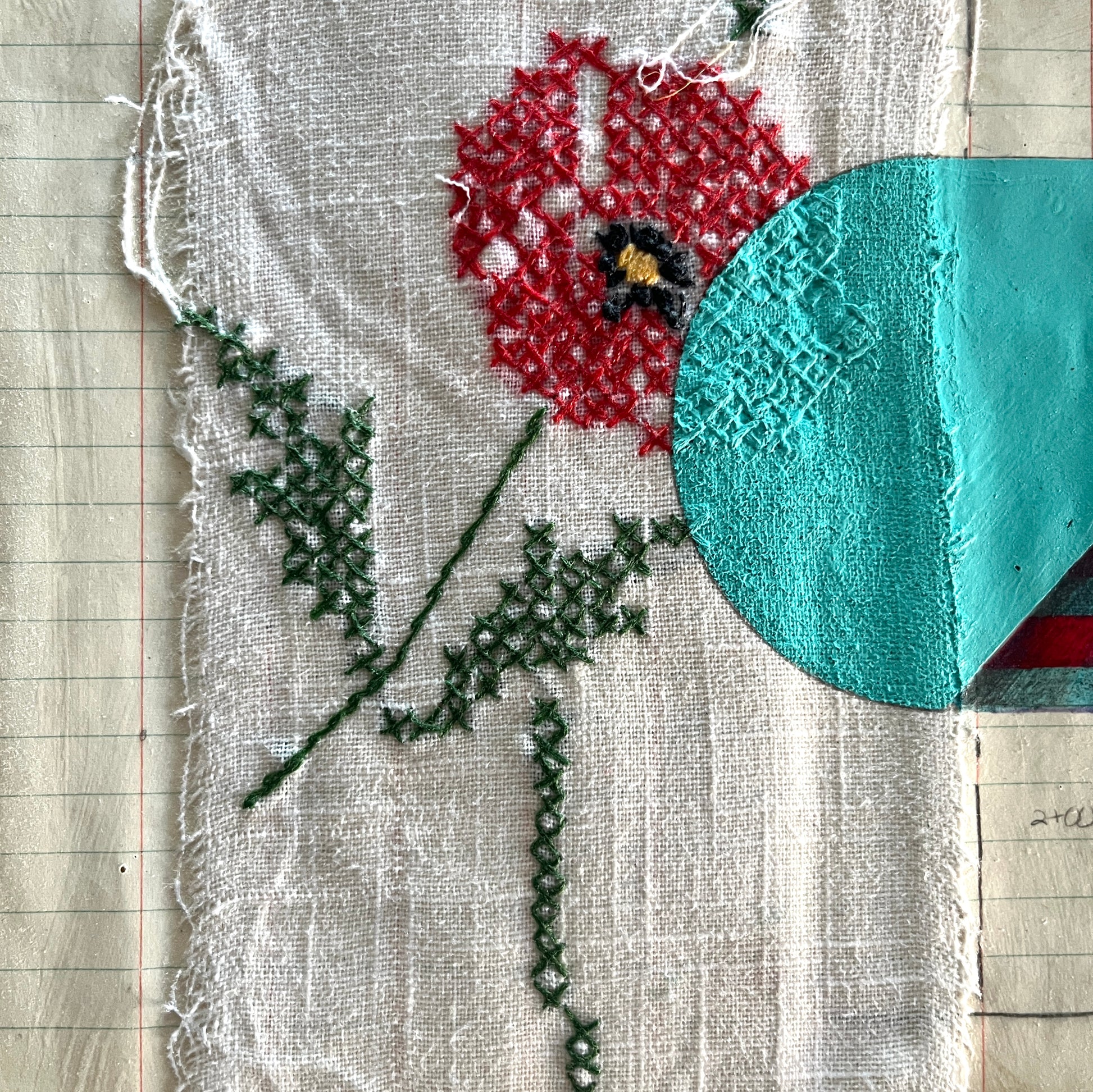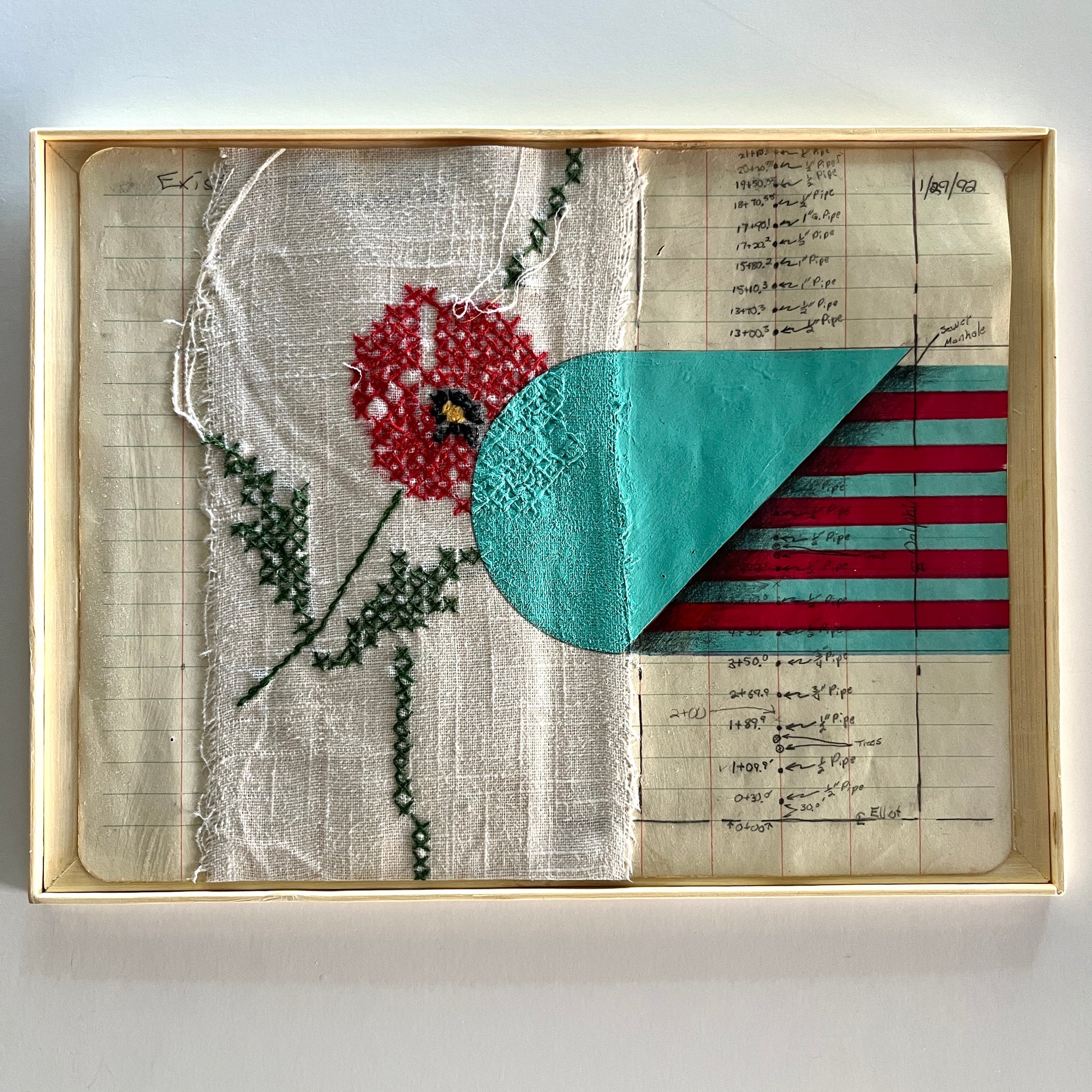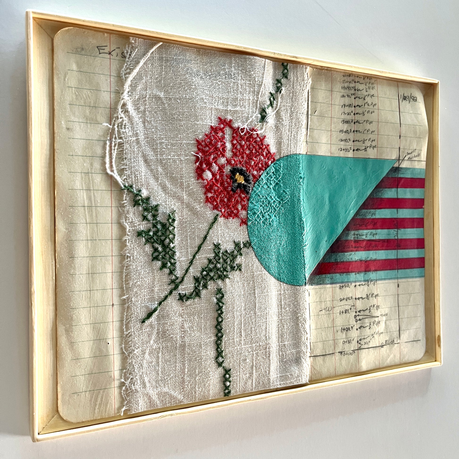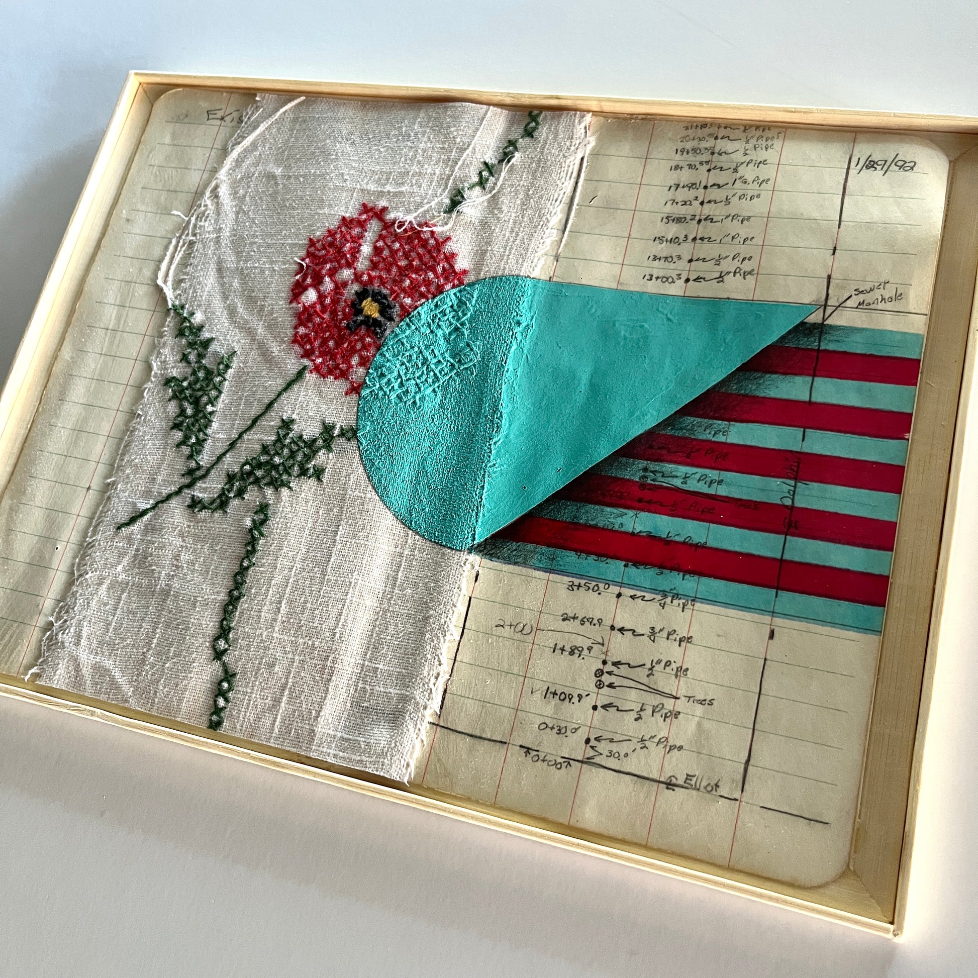 Ink and acrylic on vintage tablecloth and field book paper in wood and bamboo
