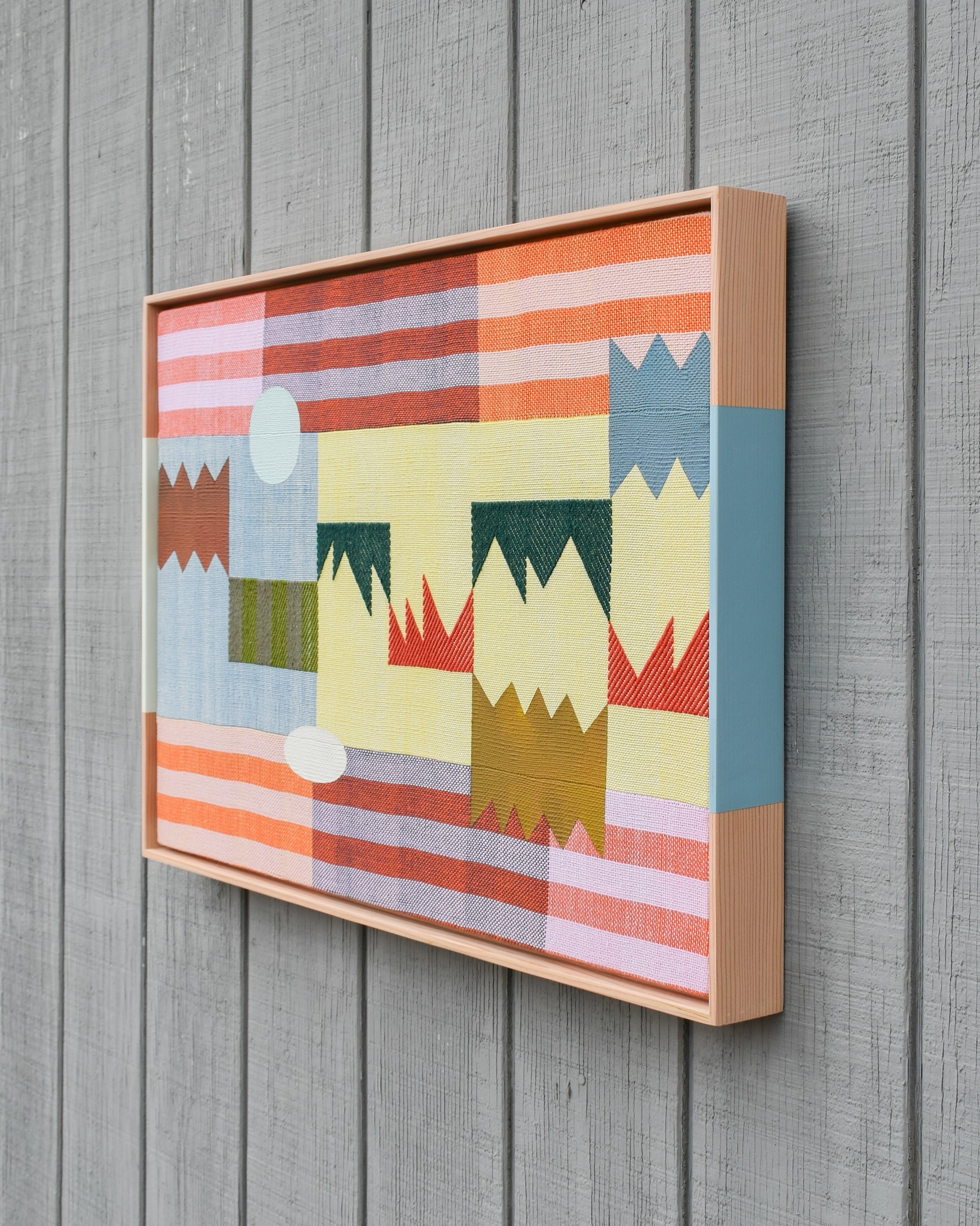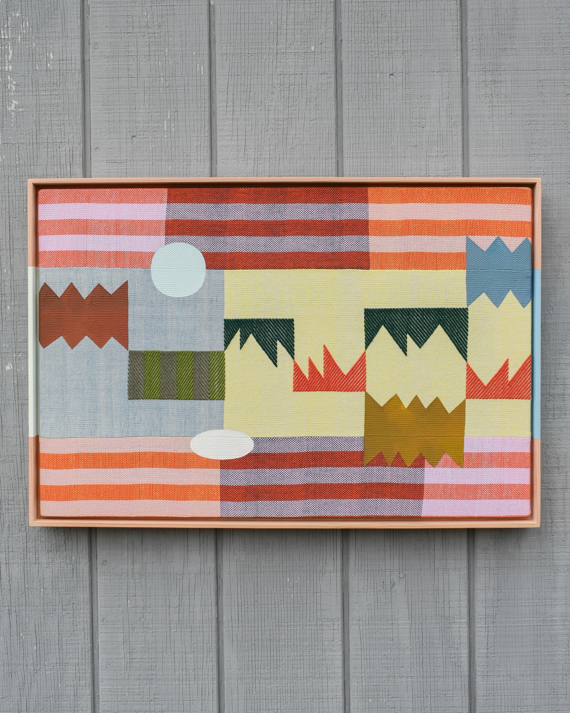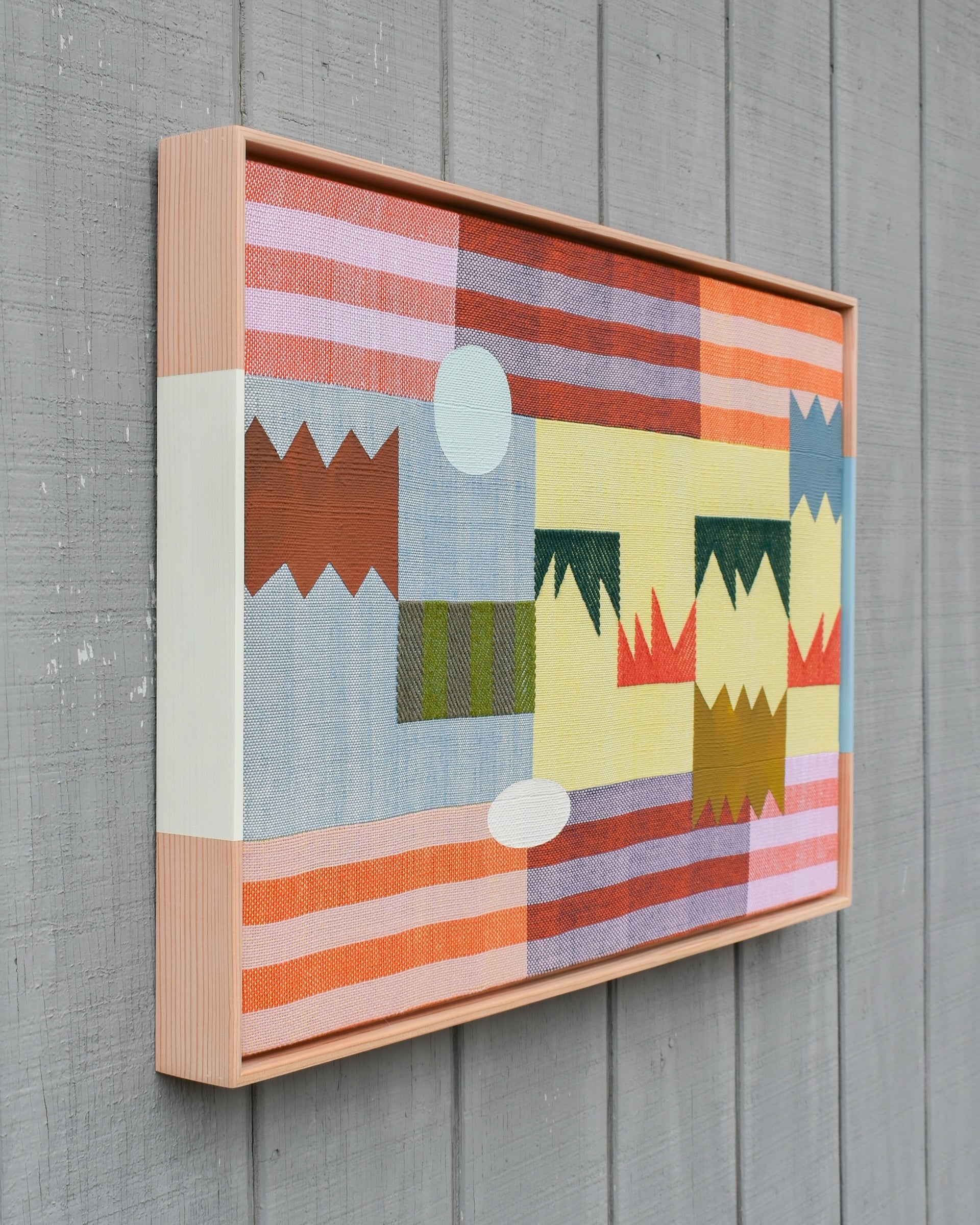 Sarah Sullivan Sherrod is a textile artist based in Tulsa, Oklahoma. Sarah combines her background of weaving, painting, and color theory to create work that celebrates the importance of play, as seen in both her process and aesthetic. Bound by the limits of the loom and materials, Sarah welcomes a heavy dose of improvisation to the rest of her practice. Each phase of creation is like a game itself, using the conversations between colors and shapes to complete the puzzle of the final work.