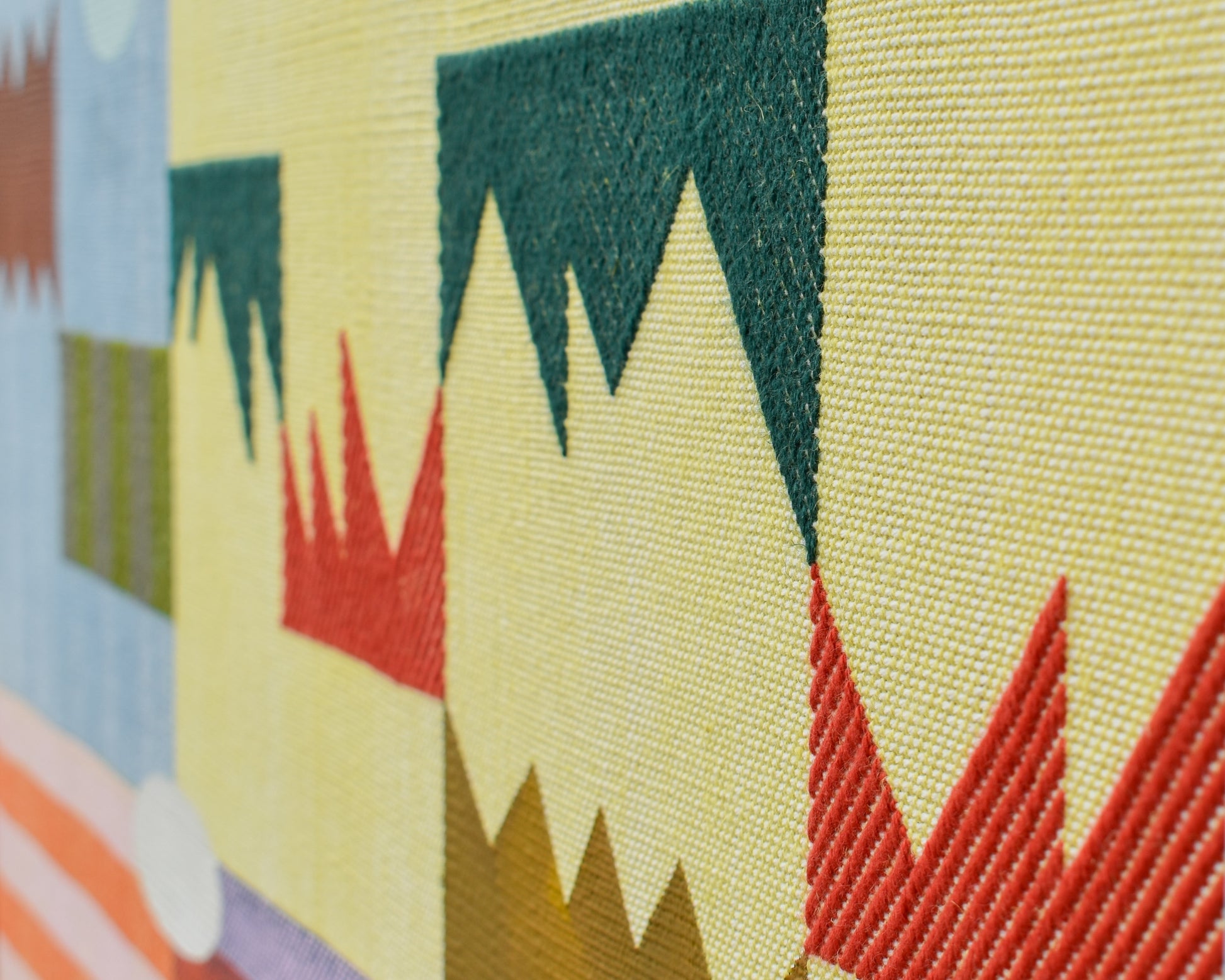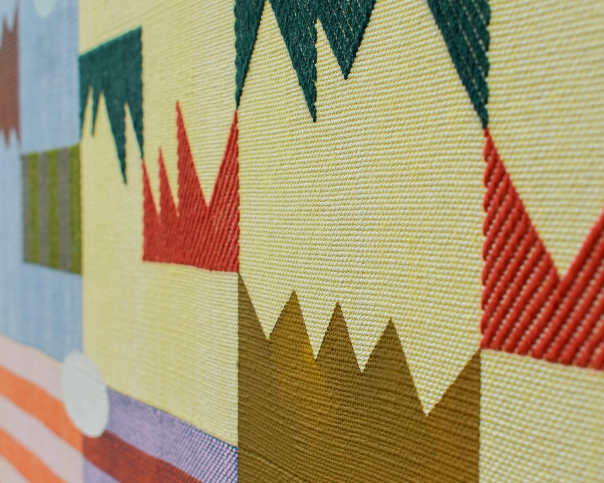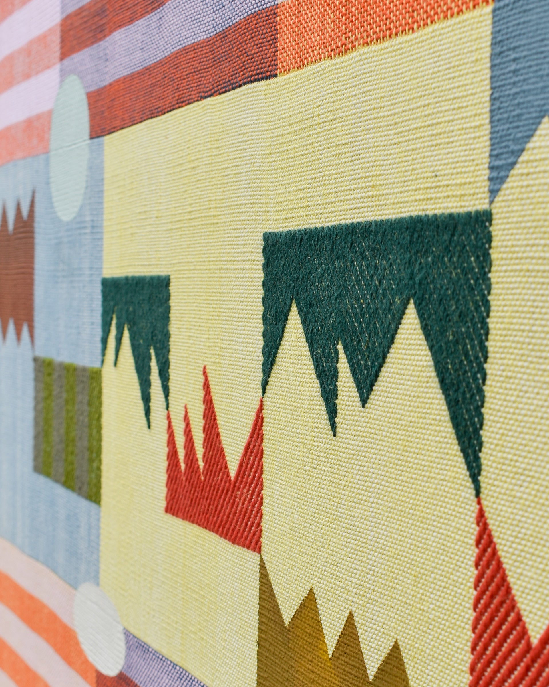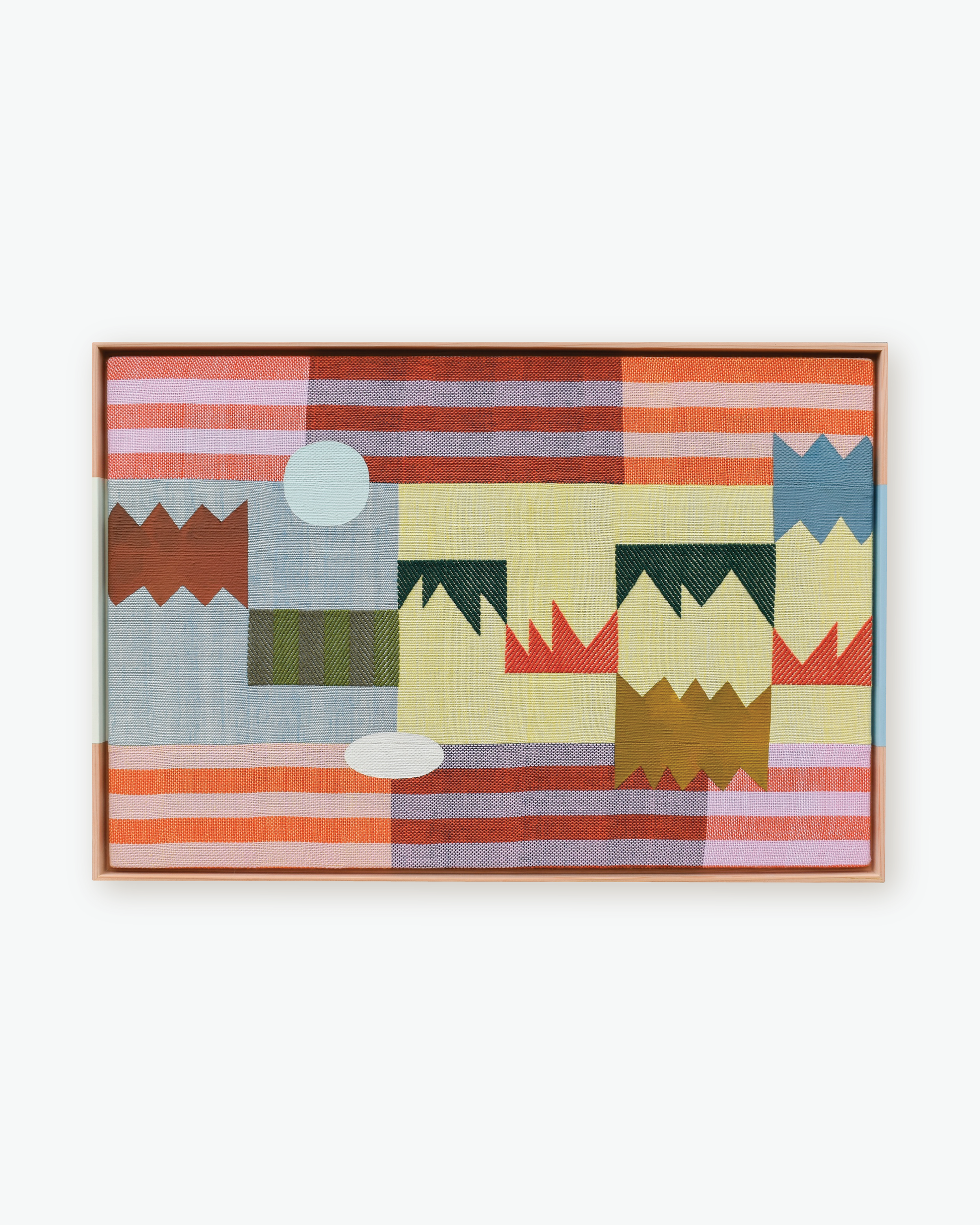 Sarah Sullivan Sherrod is a textile artist based in Tulsa, Oklahoma. Sarah combines her background of weaving, painting, and color theory to create work that celebrates the importance of play, as seen in both her process and aesthetic. Bound by the limits of the loom and materials, Sarah welcomes a heavy dose of improvisation to the rest of her practice. Each phase of creation is like a game itself, using the conversations between colors and shapes to complete the puzzle of the final work.
