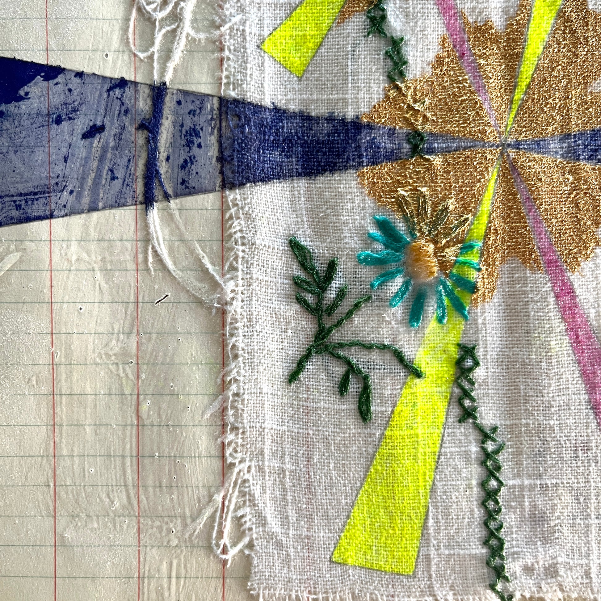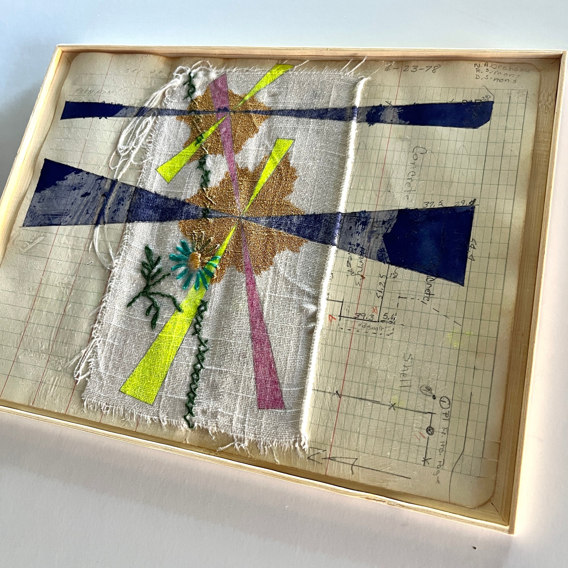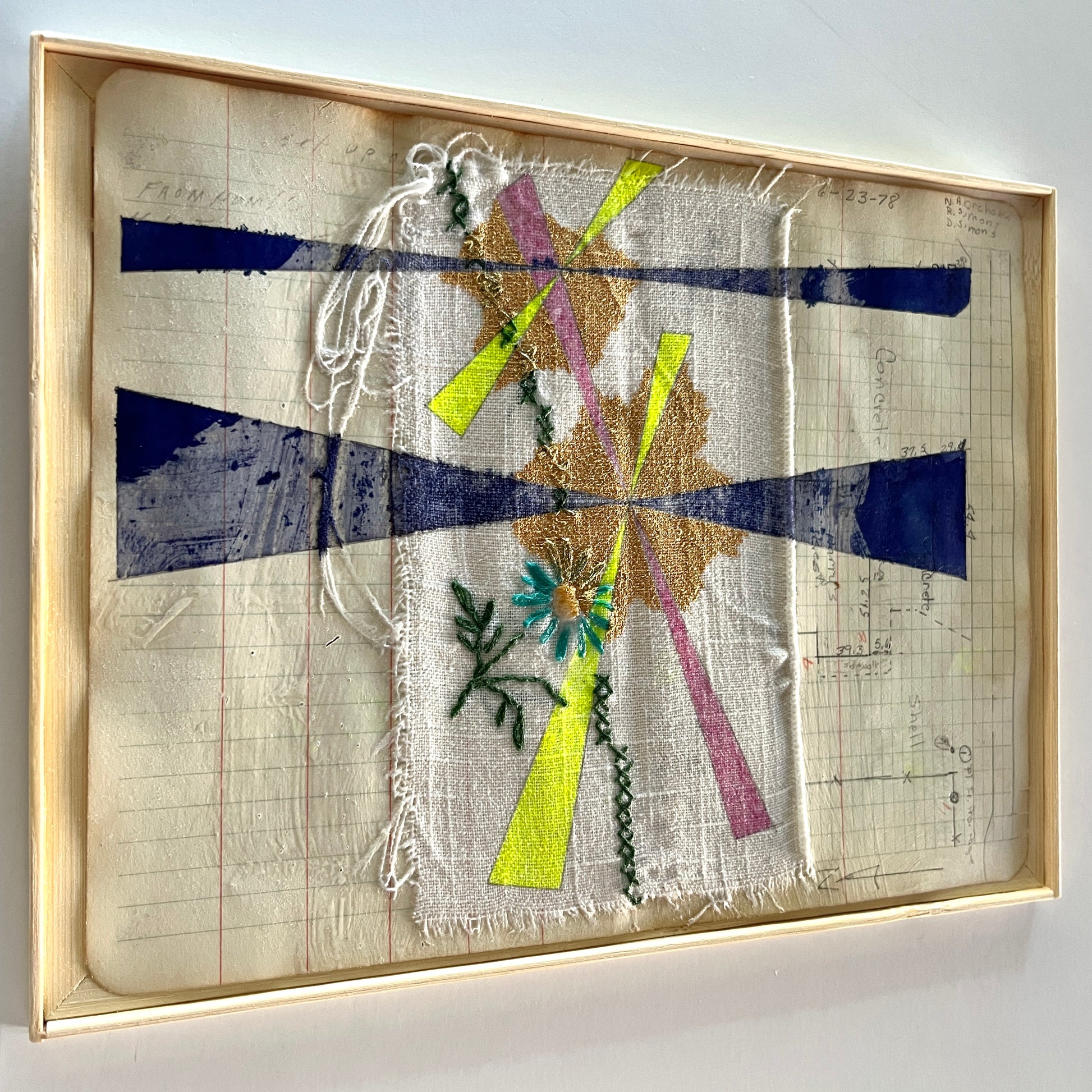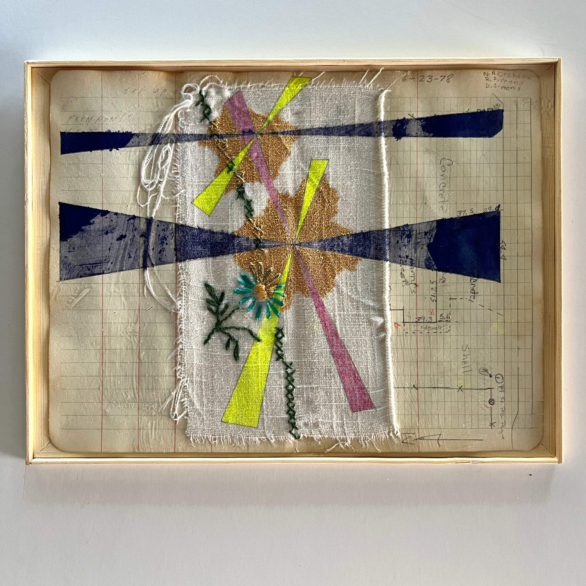 Ink and acrylic on vintage tablecloth and field book paper in wood and bamboo