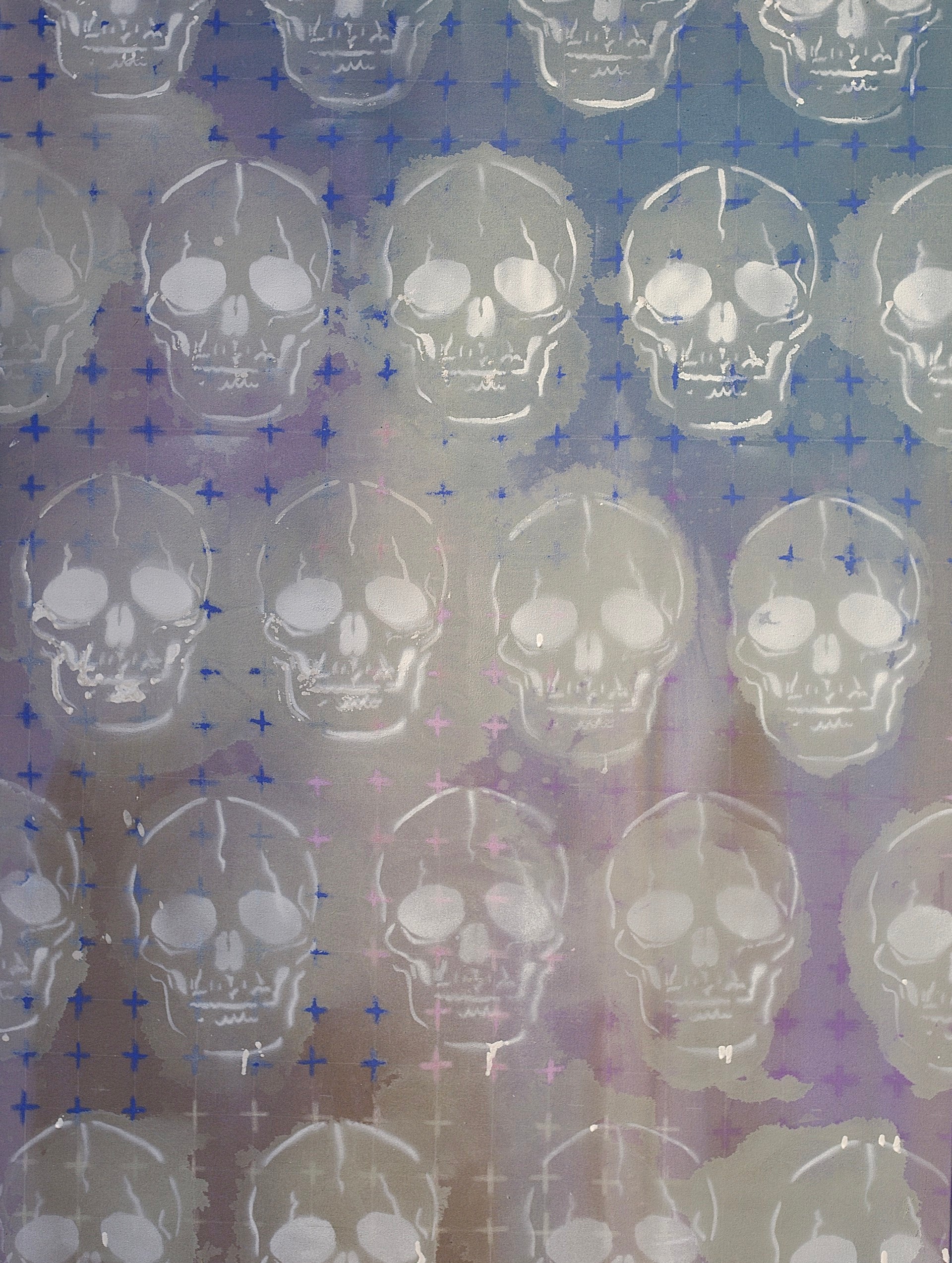 Acrylic, oil, chalk pastel, oil pastel, graphite and ink on unprimed canvas in a handmade pine floater frame